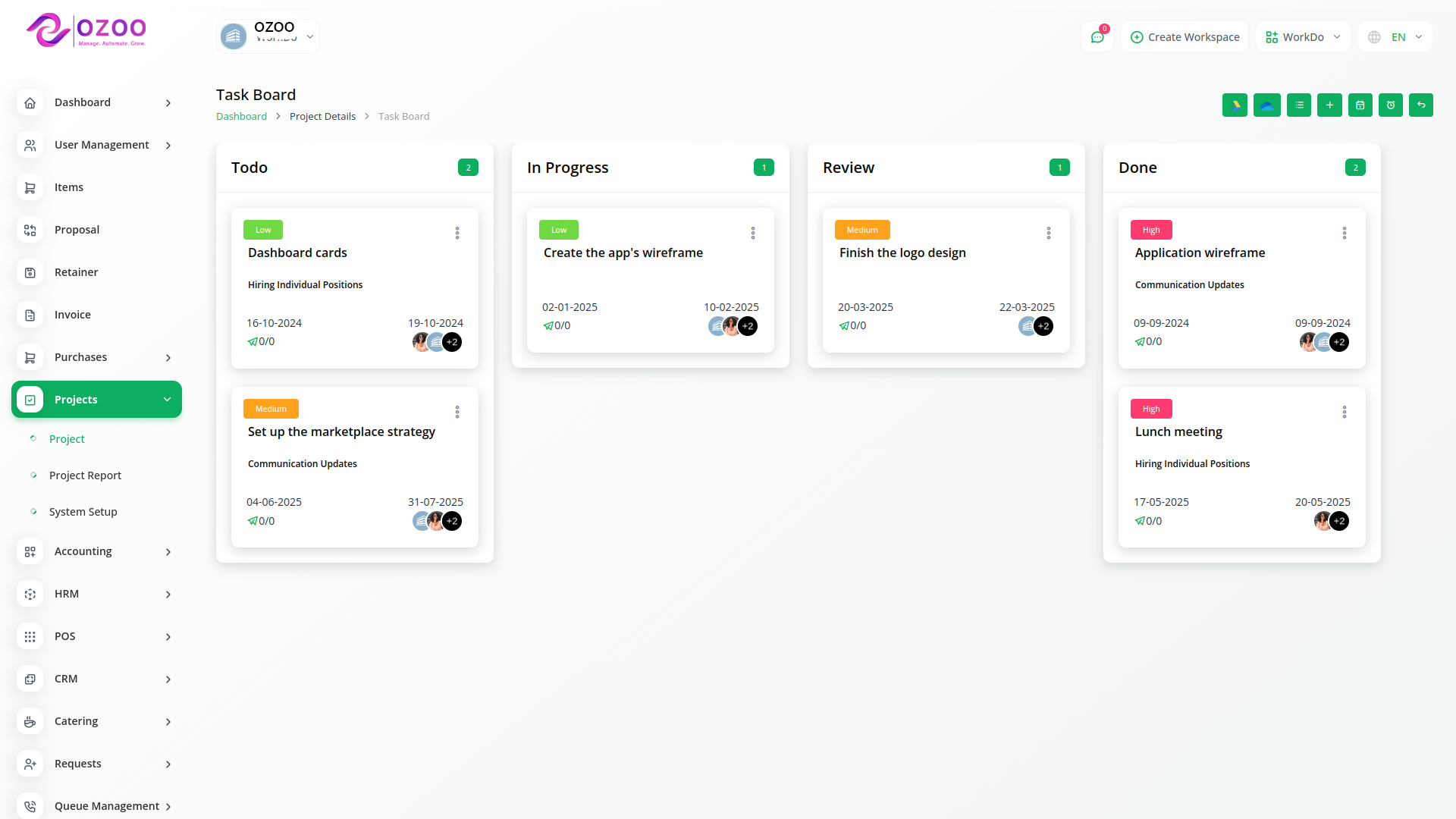 مع أوزو بيزنيس تقدر تدير كل مشاريعك من مكان واحد: أنشئ المشاريع، وزّع المهام على فريقك، وتابع العملاء بسهولة من لوحة موحّدة. تحكم كامل في الصلاحيات، تنظيم أسرع، ونتائج أوضح.