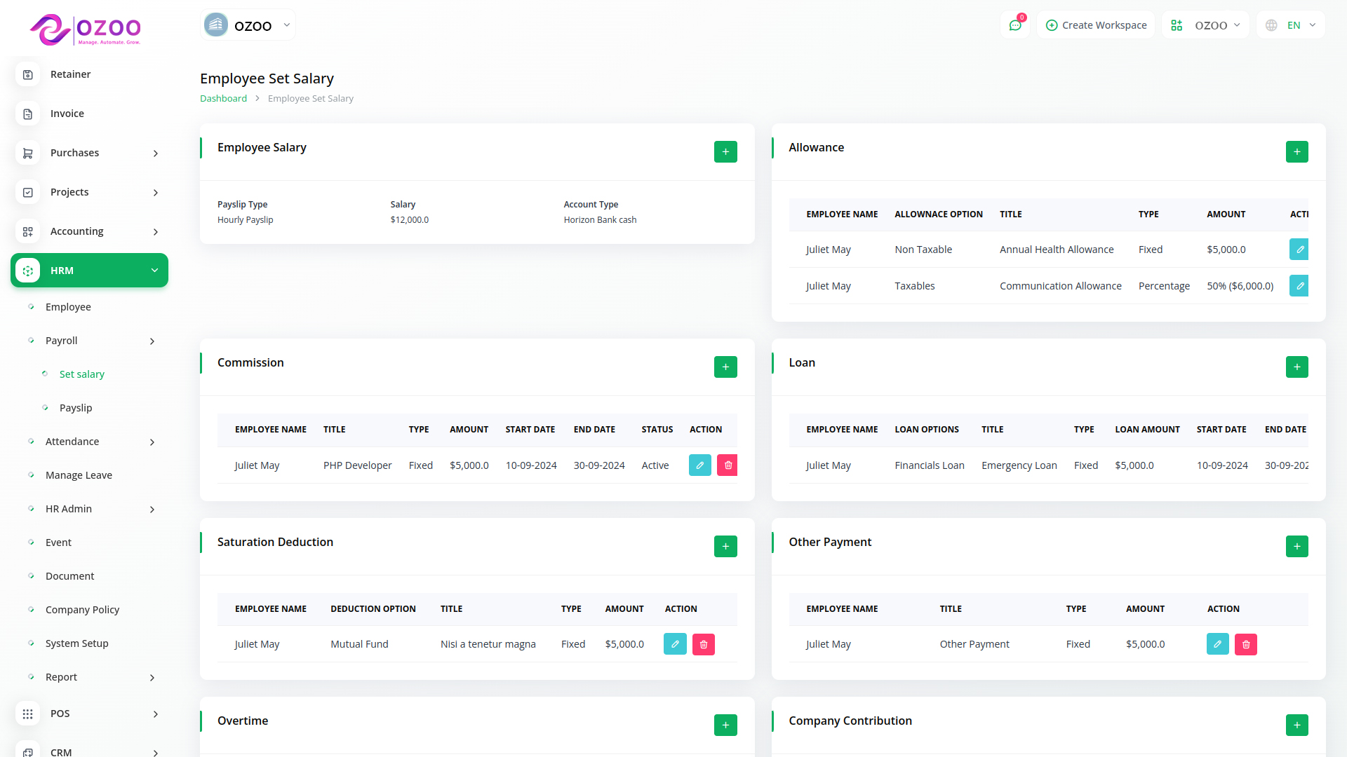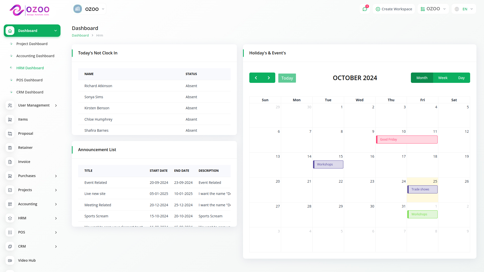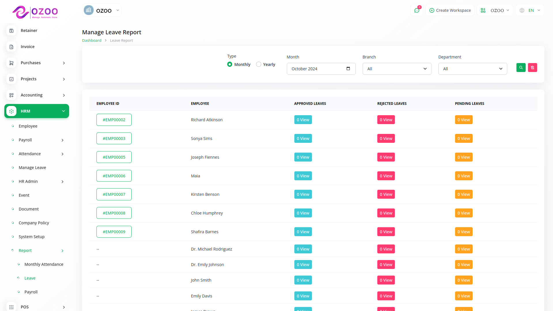 فريقك هو أعظم أصولك. سواء كان لديك 5 موظفين أو 5000، يوفّر لك أوزو بيزنيس HRM إدارة دورة حياة الموظف كاملة من مكان واحد: التوظيف والعقود، الحضور والانصراف والإجازات، تقييم الأداء، الرواتب والاستقطاعات، والمستندات. نظام مرن وقابل للتخصيص وسهل الاستخدام، مع صلاحيات دقيقة وتقارير فورية تساعدك على اتخاذ القرار بسرعة.